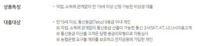 직업이 없어도, 소득을 증빙할 수 없어도 통신등급 산출이 가능한 통신 3사를 이용하고 있는 분이면 신청할 수 있으며, 통신 등급이 산출되지 않는 분은 농협은행의 중금리 모형으로 자동심사가 진행됩니다.