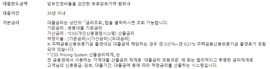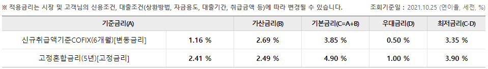 다만 위의 금리표는 예시이며, 상환방법 및 자금용도, 대출기간, 취급금액 등에 따라 달라질 수 있으니 유의바랍니다.
