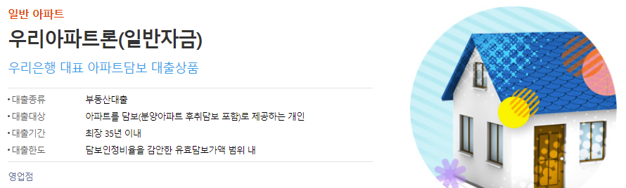 우리은행에서는 아파트를 담보로 제공할 수 있는 분의 생활안정자금 또는 필요자금을 지원하기 위한 아파트 담보대출 상품을 취급하고 있습니다.