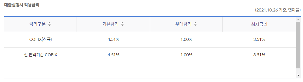 위의 금리는 참고용이며, 신청시기 및 대출을 신청하시는 분의 개인신용평점, 대출금액 등에 따라 달라질 수 있습니다.
