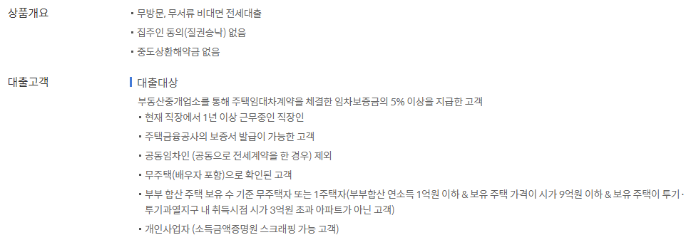 집주인 동의 없이 신청할 수 있으며, 중도상환해약금이 없다는 것이 특징입니다.