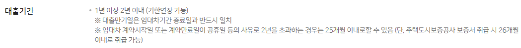 대출기간은 1년이상 2년 이내로 약정되며 대출 만기일은 임대차 계약 종료기간과 반드시 일치해야합니다.