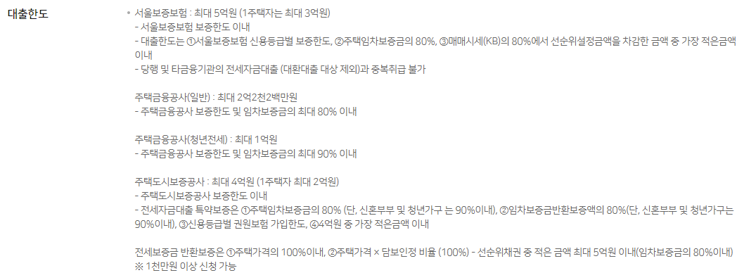 - 서울보증보험 : 최대 5억원, 1주택 보유자는 최대 3억원, 임차보증금의 80% 이내