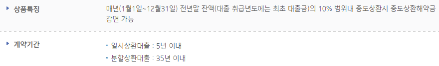 대출기간은 상환방식에 따라 다르게 적용되는데요, 만기일시상환의 경우 최대 5년이내, 분할상환 대출의 경우 최장 35년까지 이용할 수 있습니다.